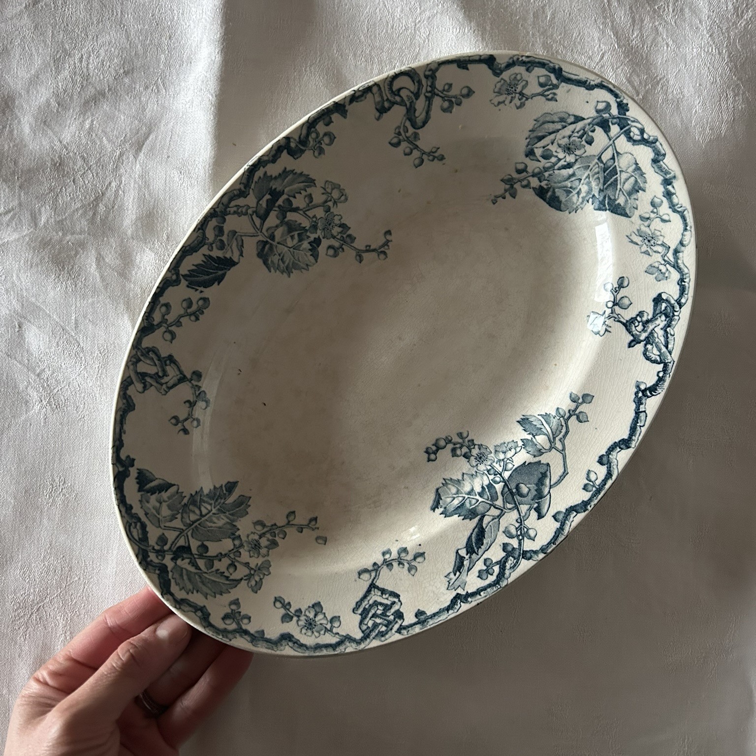 Fuente ovalada Terre de Fer, modelo Fontainebleau, manufactura de Lunéville, en un excelente estado de conservación y una maravilla por sus estampados y su color monocromático verdoso.
