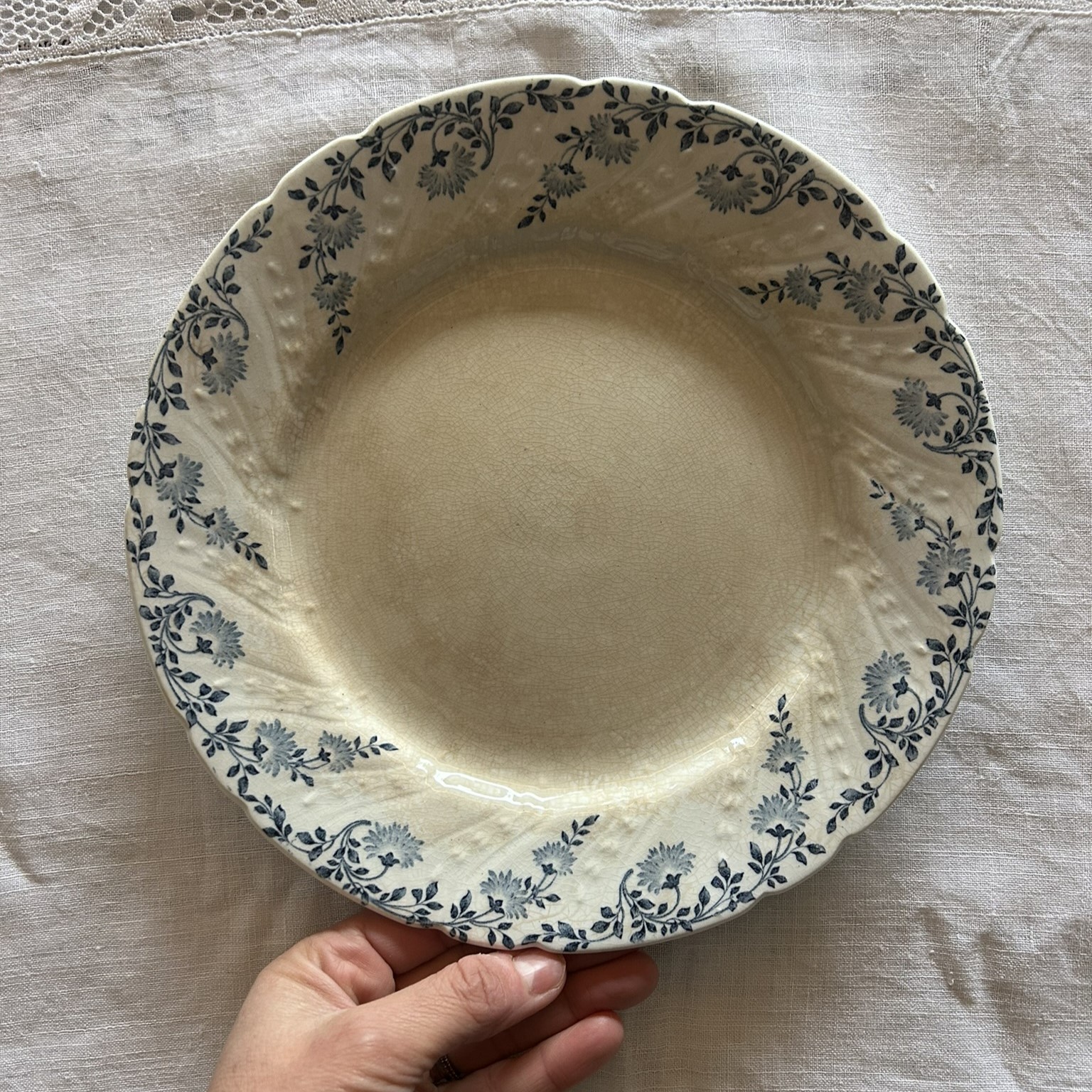25 unidades plato llano modelo Trianon, Manufacura Lunéville. Precioso modelo con cenefa de flores y color monocromático azul. Pátina marcada en todas las unidades.